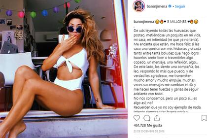 Otra mujer muy cuestionada por su cuerpo y su exposición, a lo que ella responde con su mantra "vive y deja vivir". Hoy se muestra en su mejor momento sentimental junto a Mauro Caiazza. Cuando llegó a los cinco millones de seguidores en la red social Instagram, lo celebró con un traje de baño underboob, una tendencia que comenzó hace un tiempo y de la cual la actriz y cantante no quiso quedarse afuera. Las imágenes con su hijo Momo, donde se muestra tal cual es y en su rol de mamá, son las preferidas por sus seguidores.