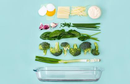 - En una sartén, rehogar en aceite de oliva el puerro picado y los dos dientes de ajo picados. Una vez cocidos, agregar las espinacas y saltear. Incorporar los brócolis. Acomodar los vegetales en una fuente de horno.