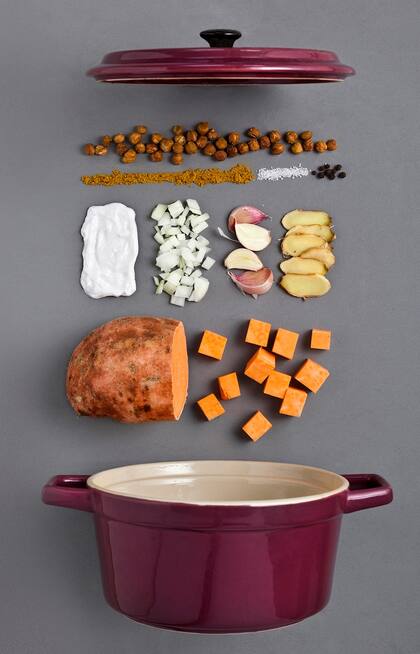 30 minutos o hasta que las batatas se deshagan. Licuar y rectificar la sal y la pimienta. Por otro lado, condimentar los garbanzos con aceite de oliva, ralladura de limón, sal y pimienta. Llevarlos al horno durante 15 minutos para que se pongan crocantes. Servir la sopa en un bol y acomodar los garbanzos en el centro. Decorar con leche de coco, semillas, hierbas y aceite de oliva.