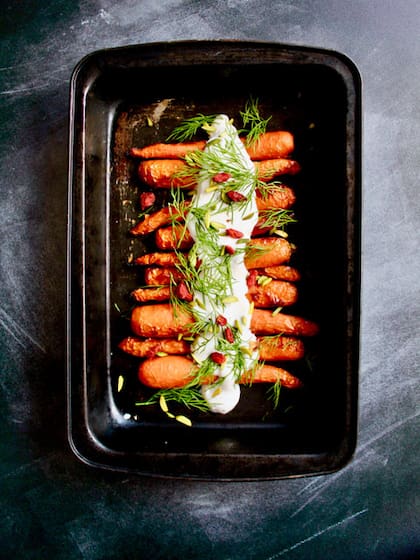 6 zanahorias medianas, 1/2 cucharada de aceite de coco (o aceite de oliva, para engrasar la placa de horno), 1 cucharada jarabe de agave o miel, 1/2 cucharada de aceto balsámico, 1/2 cucharadita de comino, 1/2 cucharadita de pimentón ahumado, 1/8 cucharadita de sal de himalaya o sal de mar fina, 4 cucharadas de yogurt de soja o almendras (si no sos vegano podés usar yogurt tipo griego, yogurt de leche de cabra o un queso untable), 1 cucharada colmada de tahina (podés reemplazarla por manteca de almendras o maní, no endulzada), 1 puñado de eneldo fresco, 1 cucharada de bayas de goji, 1 cucharada de pistachos picados