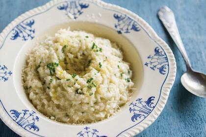Calentar una olla (que sea preferentemente de barro o hierro). Poner un poco de aceite de oliva y dorar las cebollas junto con el ajo y el bouquet de hierbas. Dejar unos minutos hasta que se vuelvan transparentes. Agregar el arroz y sellarlo. Sumar el vino y dejar que se evapore por completo, luego ir agregando el caldo de a cucharadas, hasta que el arroz esté casi a punto. A último momento, montar el risotto con la manteca en cubos, el parmesano, sal y pimienta.