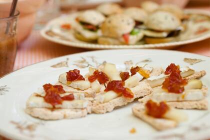 Armar las minibruschettas con un biscotti de base, un pedazo de Camembert y una cucharadita del chutney elegido. Rociar con aceite de oliva y servir.