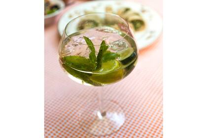 Llenar una copa con hielo. Servir el Americano, exprimir un gajo de lima y completar con espumante. Decorar con láminas de pepino y menta.
