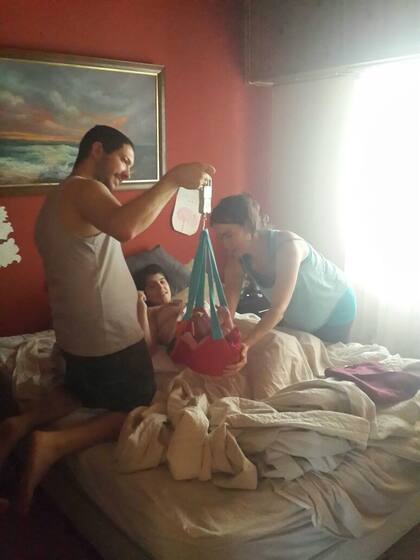 No veía la hora de poder tenerte en mis brazos, de mirarte y olerte. Durante todo ese tiempo nos imaginamos tu nacimiento y el parto. Fueron 9 meses de preparación: de charlas, eutonía, yoga, caminatas, amor, sueños y hasta la construcción de un banco de parto vertical. El jueves y el viernes, con 41 semanas cumplidas, vino Clara –la doula que nos acompañó todo el embarazo-, dulce y predispuesta, para ver si con técnicas naturales podíamos ayudar: manteo, baile, te masajes, lecturas… De esa forma transcurrieron esos días; abocados a transitar cada contracción, a esperarla, a caminar, a amarnos, a sumergirnos en eternos baños y estar solos los 3. Finalmente el domingo comenzaron las contracciones regulares. Tu papa era el encargado de anotarlas. Estábamos impactados de ver como el cuerpo y mi útero se iba contrayendo de una forma tan perfecta y sincronizada. Luego de 8 horas de trabajo de parto nos fuimos al hospital. Sentía dolor, me reía, caminé, bailé arriba de la pelota y lloré.