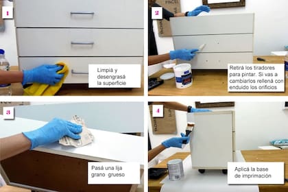 Luego de desengrasar el mueble, retirá los tiradores. Si los vas a cambiar y no coinciden los orificios de entrada, rellenalos con enduido. Lija suavemente para matar el brillo y generar buen mordiente. Aplicá dos o tres manos de base de imprimación para sellar la superficie.