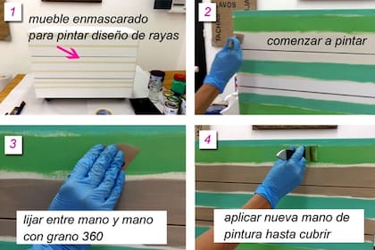 Para este mueble elegí un diseño de rayas anchas y en tres tonos, además del propio blanco de la base. Observá la imagen
