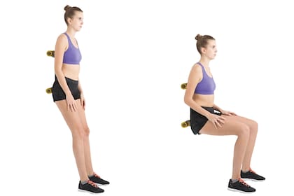 Apoyate –con el skate en tu espalda– en una pared, separando los pies un poco de la pared (a). Flexioná y extendé tus piernas, usando el skate para subir y bajar correctamente sin sobrecargar tus rodillas (b). Podés hacer hasta 45 repeticiones.