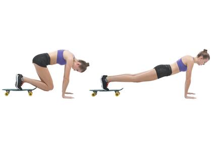 Apoyá tus pies en la patineta y las manos en el piso, redondeando la parte baja de la espalda y metiendo la panza. Luego, acercá tus rodillas hacia tu cabeza (a). Desplazá la patineta hacia atrás sin flexionar los brazos y haciendo la fuerza con los abdominales (b). Hacé tres series de diez repeticiones cada una.