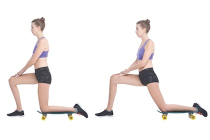 El músculo psoasilíaco está en la cavidad abdominal y en la parte anterior del muslo y suele estar muy tenso. Para estirarlo, apoyá una rodilla en la patineta y el pie contrario en el suelo (a). La otra pierna se aleja un poco con la patineta (b) y vas a sentir que "tira"cerca de la cadera.