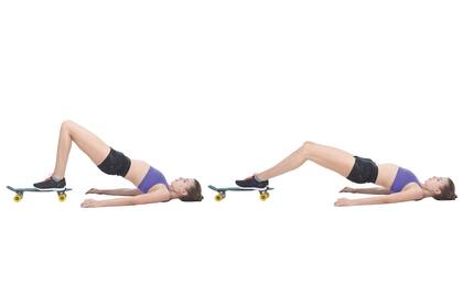 Acostada en el piso boca arriba, apoyá los pies sobre la patineta y subí vértebra por vértebra tu cola y tu espalda hasta quedar sobre tus hombros (a). Lo importante es no subir en bloque, sino articular tu columna como si dejaras una huella de cada vértebra en un piso imaginario. Mantené tu cuerpo sin quebrar tu zona lumbar ni bajar la cola. Una vez ahí, intentá estirar y flexionar tus piernas sobre la patineta (b). Hacé tres series de diez repeticiones.