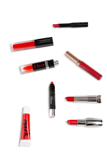 Gloss Interdit Vinyl (Givenchy, $1030). Lápiz labial True Color Ultra Matte (Avon, $360). Dior Addict Fluid Stick (Dior, $1250). Labial líquido Matific Rouge (Natura Una, $378). Mímika Tecno Lip Treatment (Lidherma, $290). Color Sensational Matte (Maybelline, $308). Mark Glossy Tubes (Avon, $200). Miss Pupa Ultra Brilliant (Pupa, $580)
