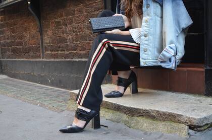 Los detalles que se pueden mencionar como motivadores de esta transición de lo clásico a lo sporty chic son por supuesto las rayas a los costados (como si se tratara de un pantalón deportivo), la campera con un estilo mas roquero con detalles de piel sintética, letras y denim que eleva el perfil de la blusa en blanco y unos buenos zapatos taco alto, que aportan siempre elegancia.