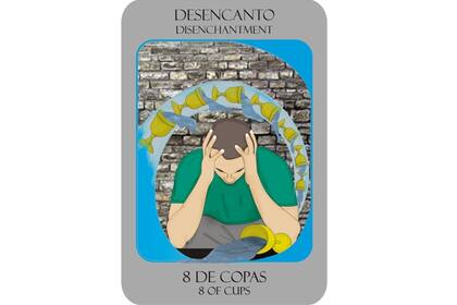 Ocho de Copas: Advierte sobre un tiempo de dolor que obliga a concientizar sobre lo que uno mismo ha generado: se está cosechando lo que uno sembró afectivamente. Desilusión que libera de hechizos y obliga a aceptar la realidad amorosa tal como es. Replanteo de vida, es preciso soltar el pasado y dejar partir. Crisis de un nivel más egoísta de amor que permitirá, si se tiene capacidad para comprender lo que sucedió, curar viejas heridas y comenzar una forma más madura de amor.