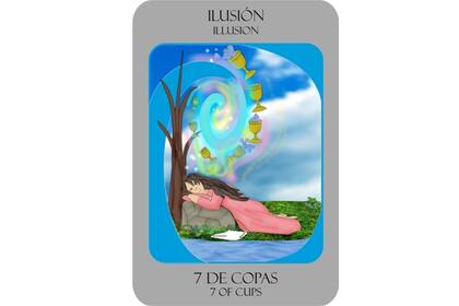 Siete de Copas: Advierte sobre cierta tendencia a la fantasía excesiva, dificultad para conectar con lo posible, delirio romántico que deja en situación eterna de espera y soledad. Se está enamorado de la idea del amor más que de una persona concreta. Reflexionar si no se intenta escapar de una realidad muy dura a través de un pensamiento mágico proyectado en esa persona amada. Necesidad de soñar y escapar, prestar atención de que se está uno escapando. Tendencia a quedar atrapado en fantasías arquetípicas, sueños eternos o visiones subjetivas de la realidad que poco coinciden con lo realizable. Propensión al desborde en los sentimientos e ilusiones marcando la inclinación a idealizar personas o situaciones que suele llevar a errores por exceso de fantasías.