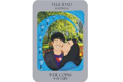 NUEVE de COPAS: Soy feliz. Sensación de plenitud y agradecimiento más allá de otro. La propia felicidad no depende de un vínculo amoroso. Si estoy en pareja mucho mejor, el amor se multiplica.