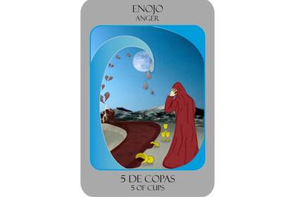 Cinco de Copas: Advierte sobre cierta tendencia a culpar al entorno y no comprenderse con la situación emocional en profundidad. La persona suele no poder hacerse cargo de la propia responsabilidad en el conflicto, le es más fácil echar culpa a los otros sin ver que esos otros muestran su propia "sombra". Entrega la llave de su felicidad o su desdicha en otros, por lo que difícilmente logre ser feliz. Si no se hace terapia o se inicia algún proceso de sanación o de autoconocimiento, se seguirá repitiendo el mismo patrón de sentirse traicionado, atrapado en broncas y enojos recurrentes.