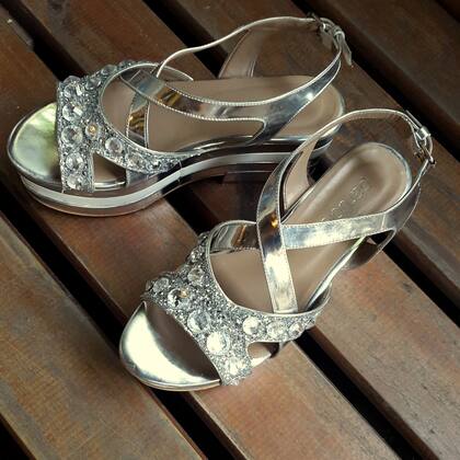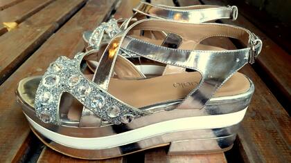Para acompañar este vestido decidí inclinarme por un calzado que me quede cómodo pero que a la vez tenga alguna relación directa con el color del vestido. Es por eso que elegí estas plataformas (si chicas, mis zapatos de cabecera obviamente) con pedrería y detalles de brillo en color plata.