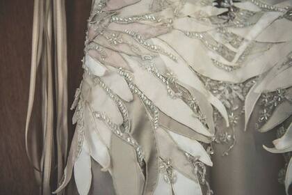 La textura que se produce por las plumas colocadas de forma tal que parezcan alas, un pespunte sastrero alrededor del ruedo de la falda de satén de seda natural, el trabajo del bies tanto en sisas como en el escote realizado en satén de seda natural colocados con mucha paciencia y amor. A su vez el ruedo de la forrería también está realizado en un bies a mano.