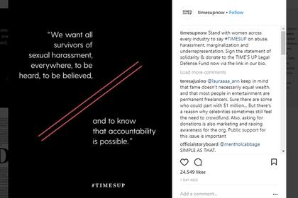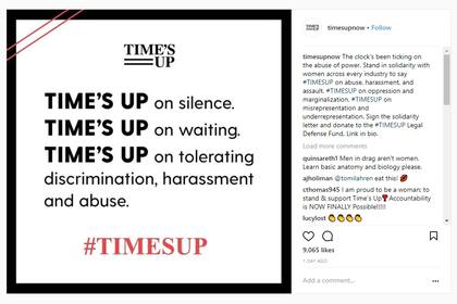 Time’s Up significa algo así como “se acabó el tiempo”. “Se acabó el tiempo del silencio, se acabó el tiempo de esperar, se acabó el tiempo de tolerar la discriminación, el acoso y el abuso”, dice la primera publicación en Instagram del perfil oficial del movimiento.