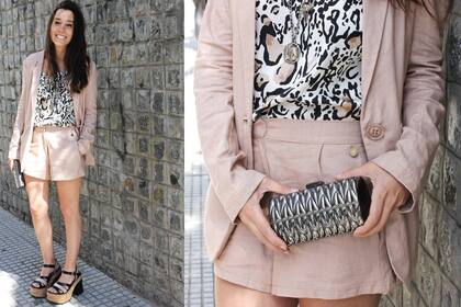 El trajecito ya lo tenia en mente y a partir de ahí elegí el resto. El color nude a mi me parece muy elegante y la combinación con detalles negros y peltres inmejorable, por eso la musculosa, los zapatos y el clutch lo acompañan engamados.