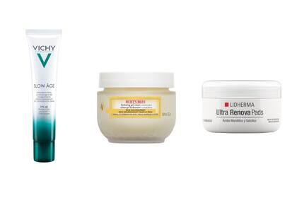 Slow Age Fluido: hidrata hasta por 48 horas y tiene FPS 40 (Vichy, $1245). Skin Nourishment: formulado con jalea real, aminoácidos esenciales para hidratar y nutrir la piel (Burt’s Bees, $689). Utra Renova Pads: tratamiento de renovación celular con ácidos mandélico y salicílico (Lidherma, $480).