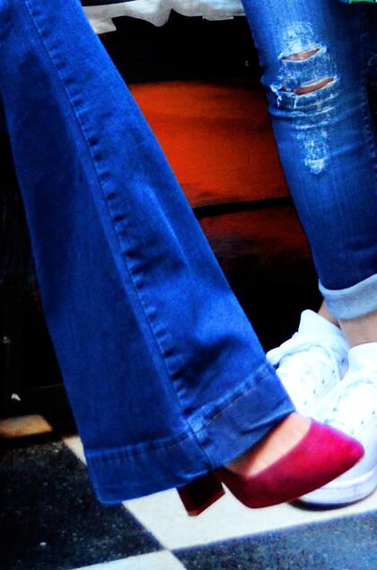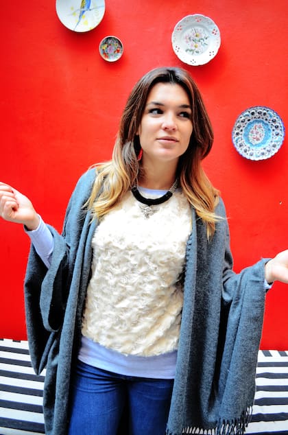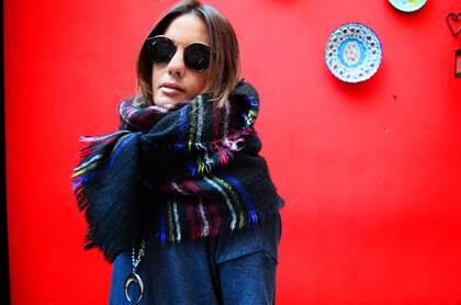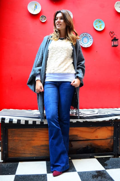 Este año los pantalones oxford están más presentes que nunca y yo soy muy amante de este corte; siento que me estilizan. Le sumé un buzo de algodón gris con un detalle de piel sintética en la parte de adelante que además de súper abrigado -no es el típico buzo estilo deportivo- y lo puedo acompañar con estos estiletos color marsala que hasta la fecha sólo los pensaba con chupines. Lo acompañé con este poncho que, al igual que la manta de Luli, es súper práctico para llevar a todos lados y super abrigado . Y para darle el toque final, un buen collar nunca esta de más si no hay mucho ruido en las prendas y los colores son neutros.