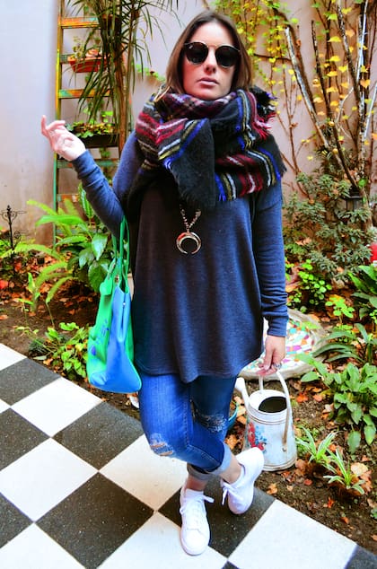 Esta vez dejé de lado mi amor por los colores fuertes en el invierno y opté por la gama de azules (o grises) depende cómo lo vean; le sumé una manta que usé como bufanda en los mismos tonos. No es novedad que el invierno no es mi estación preferida; por eso, debajo del sweater llevo una remera térmica y así evito el uso de un abrigo pesado que a veces me molesta tener que cargar. Podés optar por remeras térmicas que sean más o menos gruesas, con o sin mangas, dependerá de vos y, obviamente, de la temperatura del día.