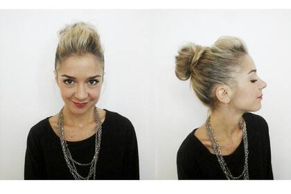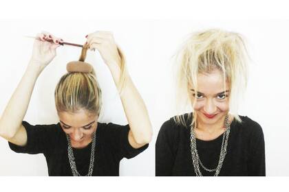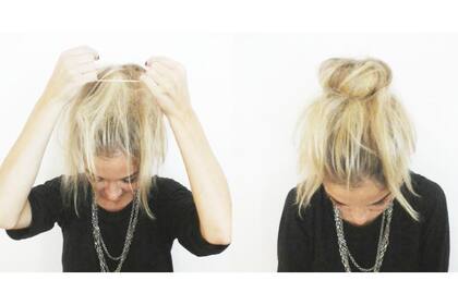 4- Ponete una bandita elástica, de las de librería. Que quede agarrando el pelo enroscado en la dona. Chequea que el pelo la cubra toda.