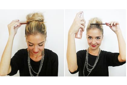 6- Poné spray en los costados de la cabeza y pasa la mano, para que queden bien pegaditos al cuero cabelludo.