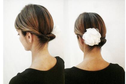 Vas a necesitar spray y dos clips. Nosotras para decorarlo un poquito le pusimos una flor, que hizo mi madre (soy Guille). En el estudio tenemos flores de tela que nos hizo mamá (porque hace vestidos de novia) así cuando les hacemos pruebas a las novias se las ponemos para que visualicen mejor el peinadete.