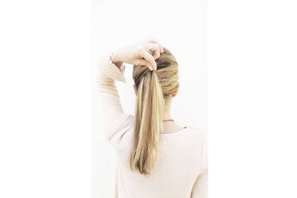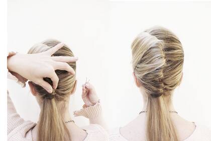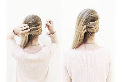 4- Agarrá el mechón que quedó arriba y enrollalo tapando el clips que quedaron ahí abajo.