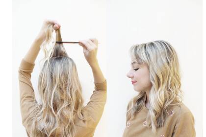 5. Tomá un mechón de pelo, agarrá hasta la altura de la oreja, y hacete una trencita. Repetí lo mismo en el otro costado de la cabeza.