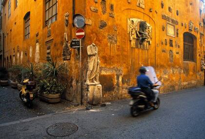 Girare in motorino ( recorrer en motocicleta ) es la típica y la mejor forma (¡y la más rápida!) de conocer Roma. Así se evita el tránsito caótico y se llega a tiempo para ver el atardecer desde la terraza del Castel Sant’Angelo, del año 139, en la orilla derecha del río Tevere, a pasos de la Ciudad del Vaticano. A esas horas, por el Lungotevere, el bulevar que corre junto al río, se ven los antiguos palacios que se asoman asumiendo una tonalidad miel.