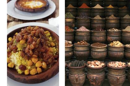 - Tajín: es una cazuela de barro en la que preparan de todo. Apenas levantás la tapa cónica, sentís el aroma. Pollo al limón, verduras, cordero o ternera se cocinan a fuego lento con muchas especias (jengibre, cúrcuma, comino y pimentón). A veces agregan dátiles, ciruelas, almendras o frutas en conserva.