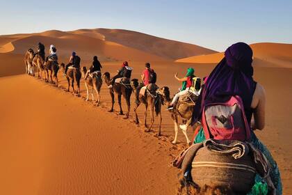 El desierto del Sahara tiene más de 9 millones de kilómetros cuadrados (casi el tamaño de China). Abarca gran parte del norte de África y se puede acceder a él desde el sur de Marruecos. Para llegar desde Marrakech, necesitás por lo menos dos días. Podés entrar a través de un pueblo llamado Merzouga, que está a 560 km al oeste. Pero si no tenés mucho tiempo, vale la pena contratar una excursión grupal para recorrer varios pueblos en el camino y atravesar el Alto Atlas: la cadena montañosa que recorre el país. Mientras el paisaje cambia del verde del valle al ocre rojizo de las montañas áridas, vas a conocer el kasbah de Ait Ben Haddou. Es una ciudad con construcciones de adobe y adornos geométricos, declarada por la UNESCO como Patrimonio de la Humanidad. Más adelante, podés visitar los "Estudios del Atlas" donde se filmaron pelis como Gladiador, Babel y Lawrence de Arabia. Por la noche, lo ideal es dormir en un hotel en la ruta en la Garganta de Dades.