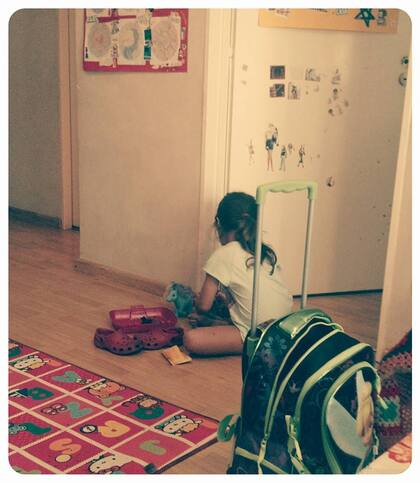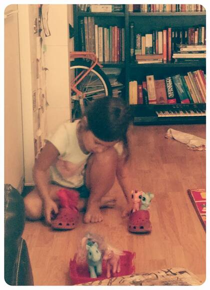 El caso es que esa primera tarde, a partir de ese empujón, intentó jugar sola, acompañarme en el espacio mientras yo hacía lo mío en la computadora. Lo intentó pero no fue fácil. Mis hijas están -bien o mal- acostumbradas a jugar entre ellas, ya lo saben.