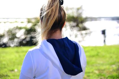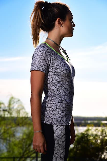 Estar al aire libre, conectarnos con la naturaleza y con nuestro propio ser es sanador en muchos aspectos y a veces, la vestimenta acompaña esos momentos ya que hay ciertos colores que favorecen ese encuentro. El azul marino es un color que me remite a uniformes que usé en mi adolescencia y en mi primera experiencia laboral: en ambos lugares fui muy feliz y aprendí muchísimo; por eso lejos de parecerme monótonos, me reconfortan. El animal print del costado da una vuelta de tuerca que me gustó sin invadir visualmente. El blanco es un color que calma por excelencia y además está combinado con el mismo azul. Como mencionamos más arriba, el hecho de que sean prendas ajustadas colabora con la movilidad y la comodidad.