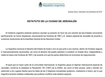 El Gobierno argentino entiende oportuno recordar su posición en favor de una solución de dos Estados conviviendo pacíficamente, en forma respetuosa, reconociendo las fronteras de 1967 y el estatus especial de Jerusalén de acuerdo a sucesivas resoluciones de la Asamblea General de las Naciones Unidas.