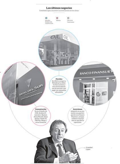 La incalculable masa de recursos obtenidos por López en el campo de las apuestas aceleró su desarrollo en otras actividades. Sobre todo, la energía, a la que estuvo ligado en sus orígenes como proveedor de servicios de YPF . Si bien el petróleo es un rubro muy distinto a las tragamonedas, el modelo es siempre el mismo: los Kirchner pusieron a disposición de su amigo zonas completas del Estado, para que él incrementara su riqueza a base de decretos. Cristóbal condensa en su carrera un modo de entender los negocios, la relación de lo público con lo privado, el financiamiento de la política y el enriquecimiento de los líderes políticos, que ha teñido los últimos 12 años de la vida pública argentina.