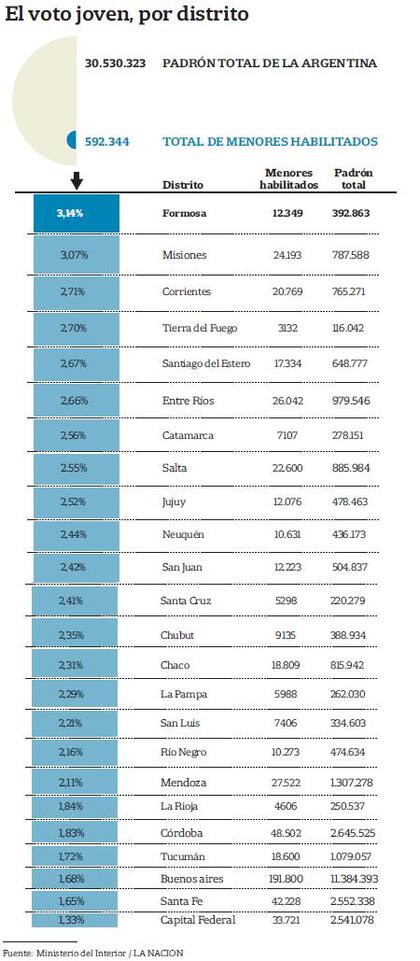 Los jóvenes de 16 y 18 años que están en condiciones de votar en las próximas elecciones son el 1,9 por ciento del padrón. Se trata de un total de 592.344 adolescentes que renovaron su DNI y podrán elegir legisladores, tanto en las internas abiertas del 11 de agosto como en las generales del 27 de octubre.