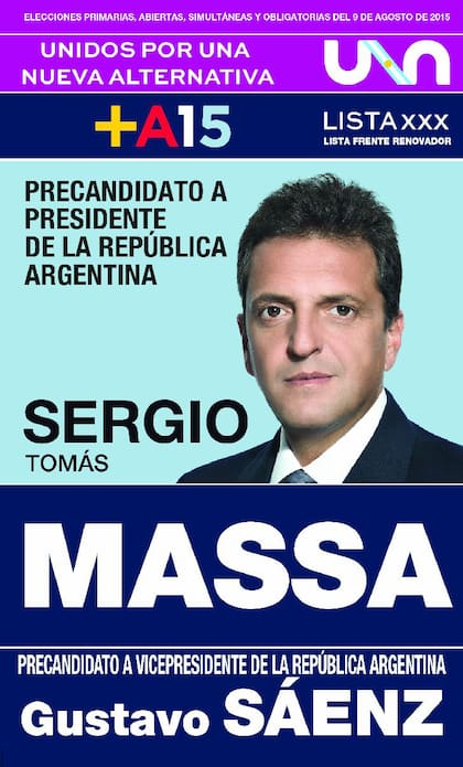 La papeleta, de color turquesa y azul lleva a la foto y el apellido de Massa. También puede verse el logo "+A2015" y el nombre de la alianza electoral Unidos por una Nueva Alternativa (UNA), dentro del cual el tigrense competirá las primarias contra el gobernador de Córdoba, José Manuel de la Sota (PJ).