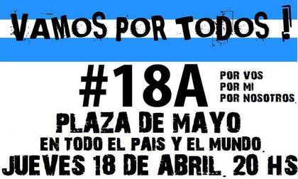 A pocos días de una nueva manifestación contra el Gobierno, convocada para el próximo jueves, grupos conectados a través de la red social Facebook impulsan la protesta a través de variadas consignas como "Digamos basta 18 A", "Vamos por todos #18 A, por vos, por mí, por nosotros", "Yo también estoy indignado, 18 A todos a la calle", y "#18 abril, sí a la justicia independiente".