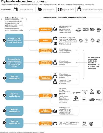 De las seis empresas en las que propone dividirse, la primera conservaría los medios clave: los canales 13 de Buenos Aires y 12 de Córdoba, y las emisoras de radio AM y FM en esas ciudades y Mendoza, además de la señal de noticias TN. También prevé que esta unidad -la más grande en términos de licencias, pero no la más importante en términos económicos- conserve 24 licencias para la distribución de TV por cable en las localidades donde no tenga TV abierta (lo que está prohibido por la ley).