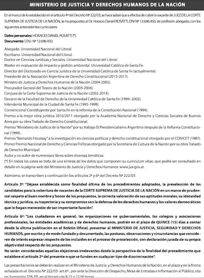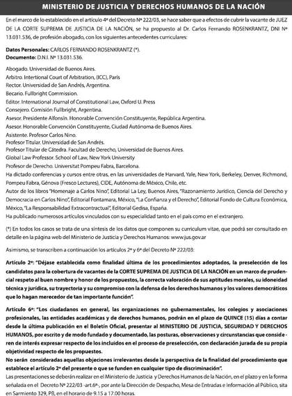 El aviso oficial publicado en la Primera Sección del Boletín que propone a Carlos Fernando Rosenkrantz (DNI 13.031.536) destaca entre sus antecedentes curriculares haberse desarrollado como "Arbitro de la International Court of Arbitration, (ICC), París; Rector de la Universidad de San Andrés, Argentina; Becario de Fullbright Commission; Editor del International Journal of Constitutional Law, y asesor del ex presidente Raúl Alfonsín, entre otros trabajos.