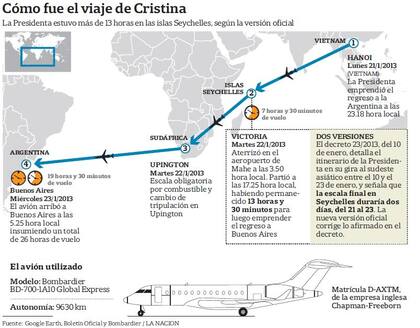 El 21 de enero de 2013, a las 23.18 (hora local), Cristina Kirchner despegó de Vietnam a bordo de un avión matrícula inglesa D-AXTM. La aeronave y su tripulación estaban en condiciones de volar 13 horas. Sin embargo, sin que mediara una emergencia, 7 horas y media después el avión aterrizó en el aeropuerto de Mahe, Seychelles, un paraíso turístico y fiscal en el océano Índico . Las preguntas empiezan allí.