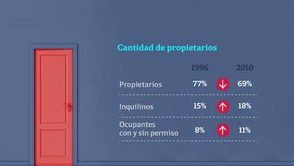 Fue la primera vez que la tasa de propiedad cayó entre censos desde el registro de los 80. La contrapartida de este cambio en el porcentaje de dueños fue un aumento de los inquilinos que pasaron de ser 15 a 18%, y de los ocupantes (con y sin permiso) que pasaron de ocho a 11%. "Los primeros aumentaron significativamente la participación entre los hogares de ingresos medios y medio-altos y los segundos entre los de bajos ingresos", concluye Goytia.