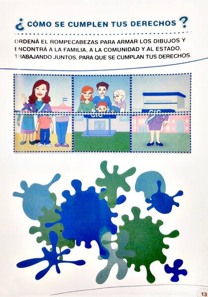 "Ordená el rompecabezas para armar los dibujos y encontrá a la familia, a la comunidad y al Estado, trabajando juntos para que se cumplan tus derechos", dice la consigna del cuadernillo que imprimió la Secretaría Nacional de Niñez, Adolescencia y Familia.