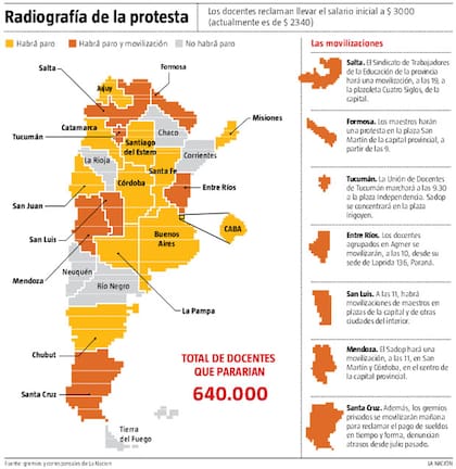 Además del paro habrá movilizaciones en Tucumán, Formosa, Entre Ríos, Mendoza, San Luis y Salta. Anoche, el gobierno porteño admitía que al menos 8 o 9 de los 17 gremios locales adherían a la medida de los sindicatos nacionales, a pesar de que es uno de los distritos en los que ya se alcanzó un acuerdo de mejora salarial.