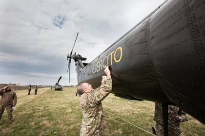 Entonces fue el turno de la foto de rigor: posaron al lado de los helicópteros de guerra -que también se usan para rescates-. "A las 11.55, todos sentados en las aeronaves hasta que nos toque salir", fue la orden que impartió el Coronel Sergio Esteban Di Clemente.