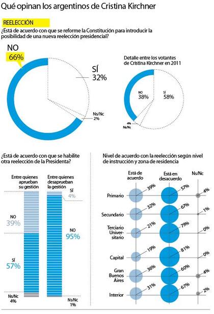 Según los datos que refleja el sondeo , el desacuerdo con la reforma constitucional para cambiar la cláusula de reelección es casi total entre los votantes de opciones opositoras en 2011: 95%. En cuanto a la zona de residencia de los electores, el mayor rechazo se da en la ciudad de Buenos Aires, donde el 81 por ciento se declara en contra. En el conurbano bonaerense es donde el apoyo a la posibilidad de cambio obtiene más respaldo: el 36 por ciento dijo que aceptaría la reforma para permitir un tercer período presidencial.